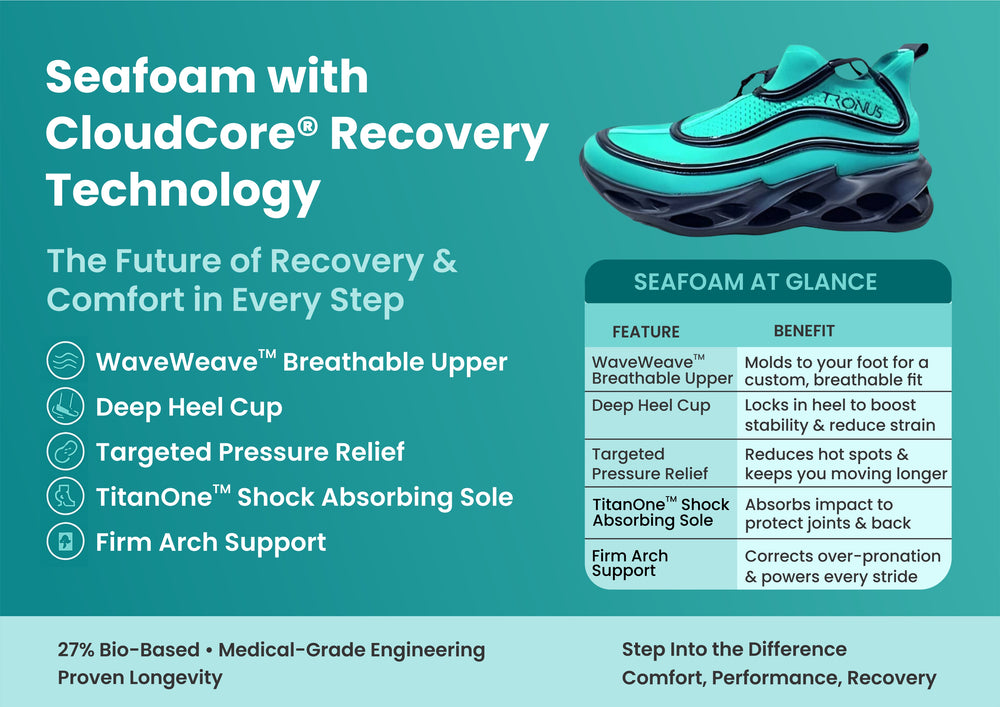 Engineered for performance recovery and everyday endurance, Seafoam CloudCore™ reduces fatigue, protects joints, and keeps you moving longer.