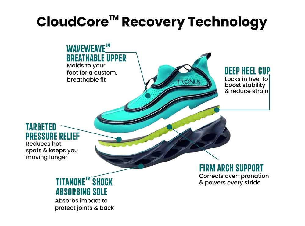 Seafoam — one of TRONUS’ most-loved colorways — returns in alimited 100-pair release, now enhanced withCloudCore™ Recovery Technology for cushioning, support, and next-level comfort.